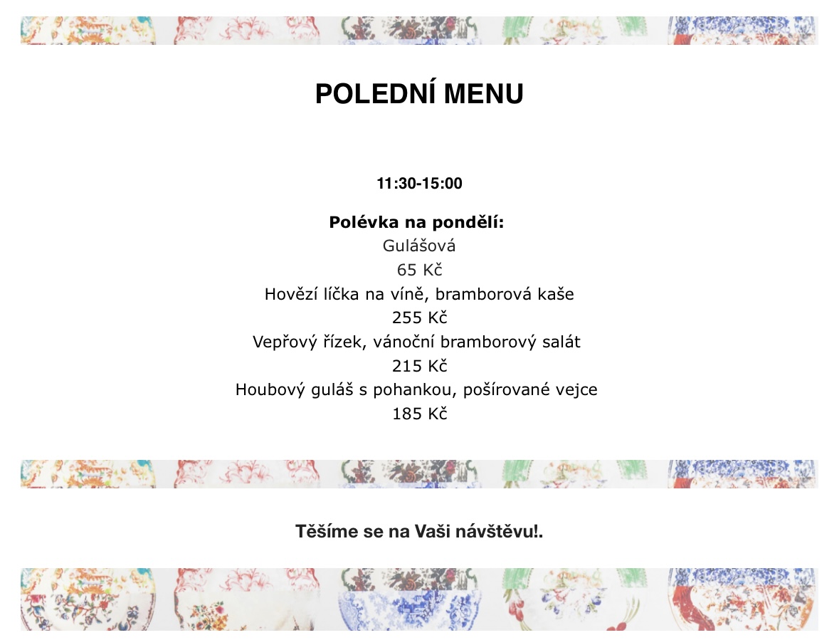 K obědu či k večeři nabízíme výběr z jednoduchých jídel, která děláme vždy poctivě a s láskou. Samozřejmě si jídlo můžete zpříjemnit řemeslým pivem nebo skvělým vínem. Naši nabídku připravujeme z těch nejlepších a čerstvých surovin, pokud možno lokálních.